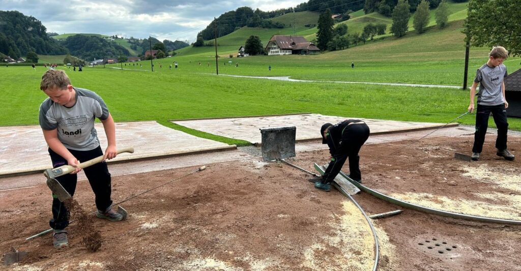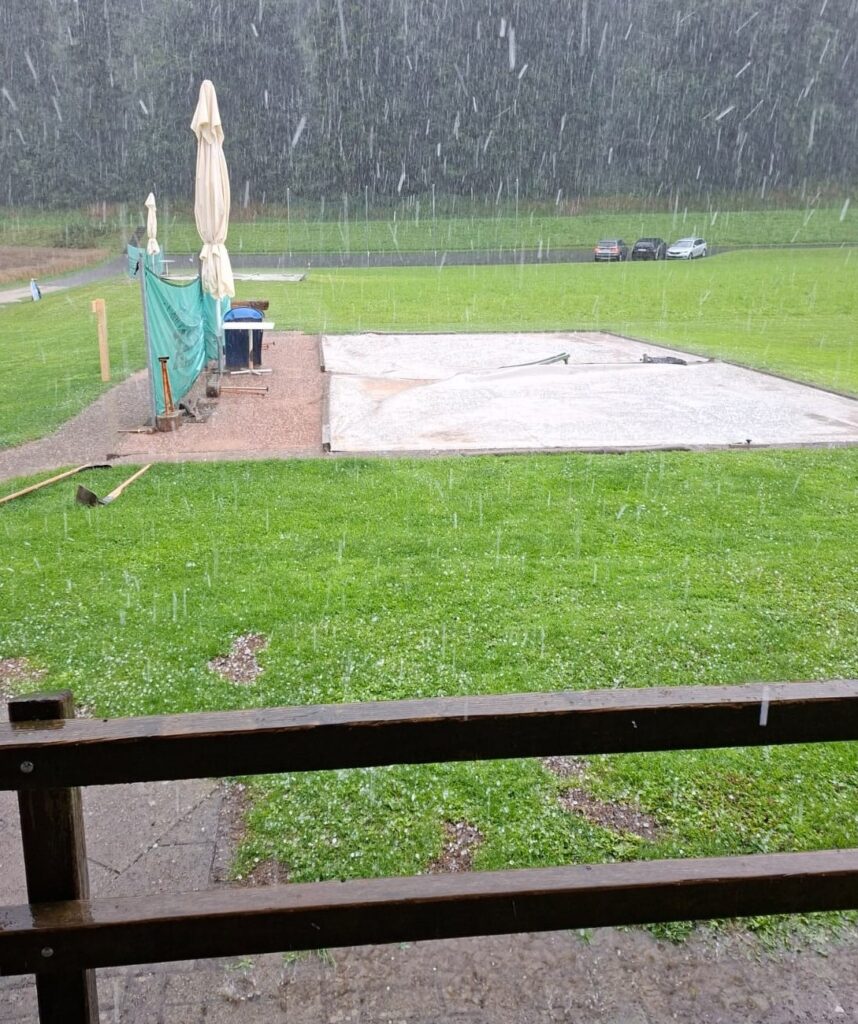 Viele haben bereits in frühen Jahren den Spruch gehört: «Es gibt kein schlechtes Wetter, nur schlechte Ausrüstung». Wer in einer Outdoorsportarten wie Hornussen aktiv ist, kennt dies nur zu gut. Es gibt aber Momente, wo ein Unterbruch des Spielbetriebs unumgänglich ist. Um die Mittagszeit zog ein Schauer mit kleinen Hagelkörnern über das Festgelände. Alle Anwesenden zogen sich in das Festzelt zurück. Bevor es weiter gehen konnte, kamen Pumpen zum Einsatz, welche die Bockstände wieder vom Wasser befreiten.